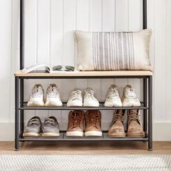 Je kan aan dit garderoberek verschillende jassen, tassen of hoeden kwijt. Op het bankje kan je jouw schoenen aantrekken. En onderaan dit rek heb je tenslotte plaats voor jouw schoenen. Praktisch, niet?