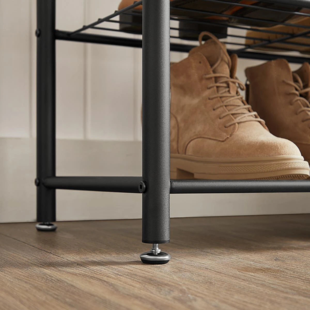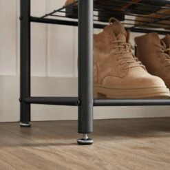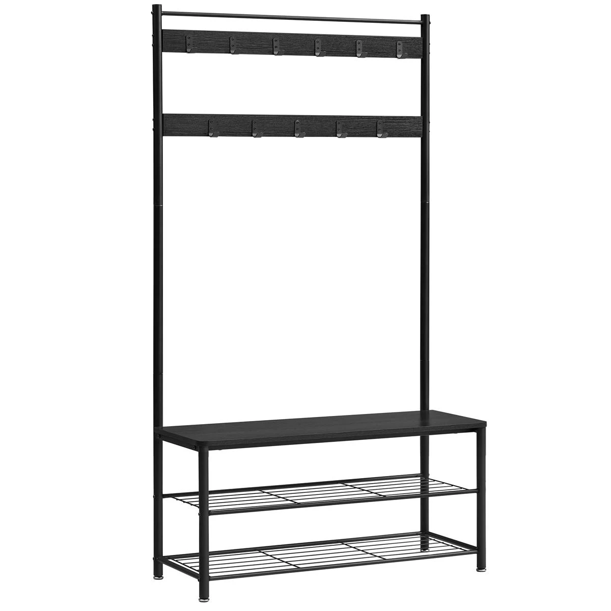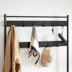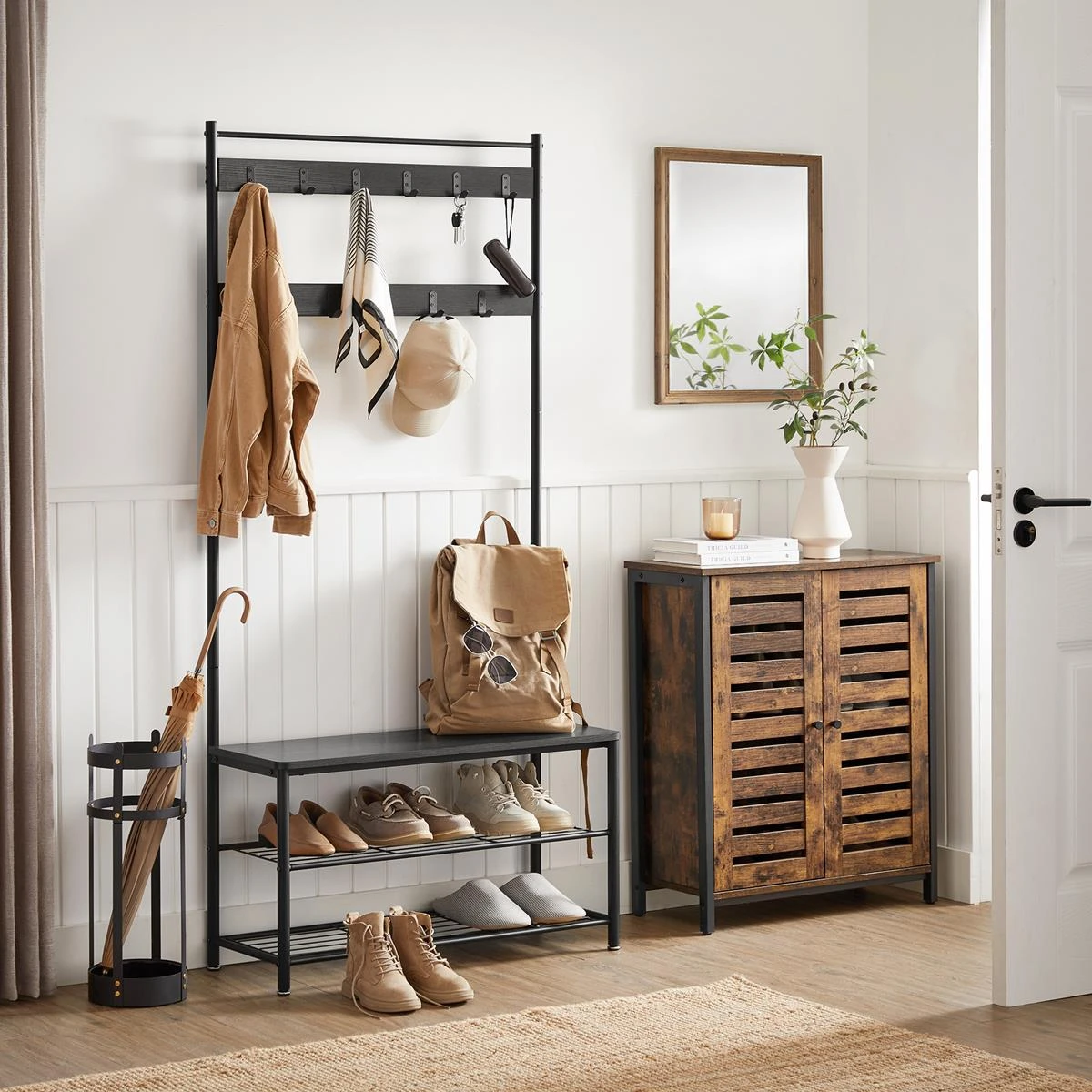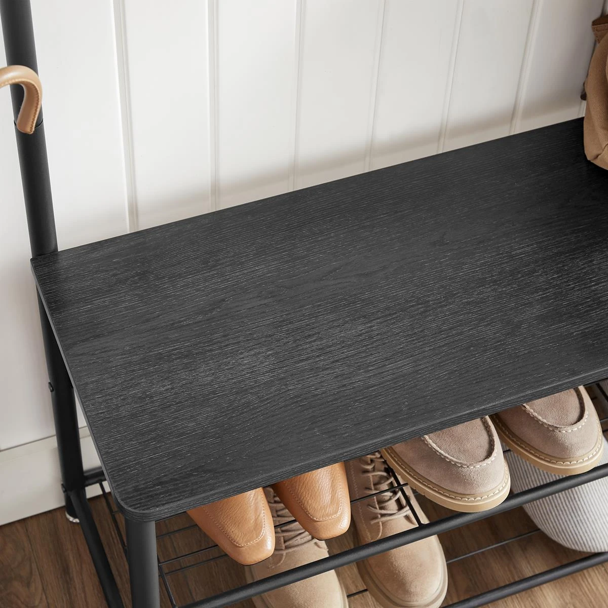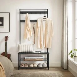 Je kan aan dit garderoberek verschillende jassen, tassen of hoeden kwijt. Op het bankje kan je jouw schoenen aantrekken. En onderaan dit rek heb je tenslotte plaats voor jouw schoenen. Praktisch, niet?