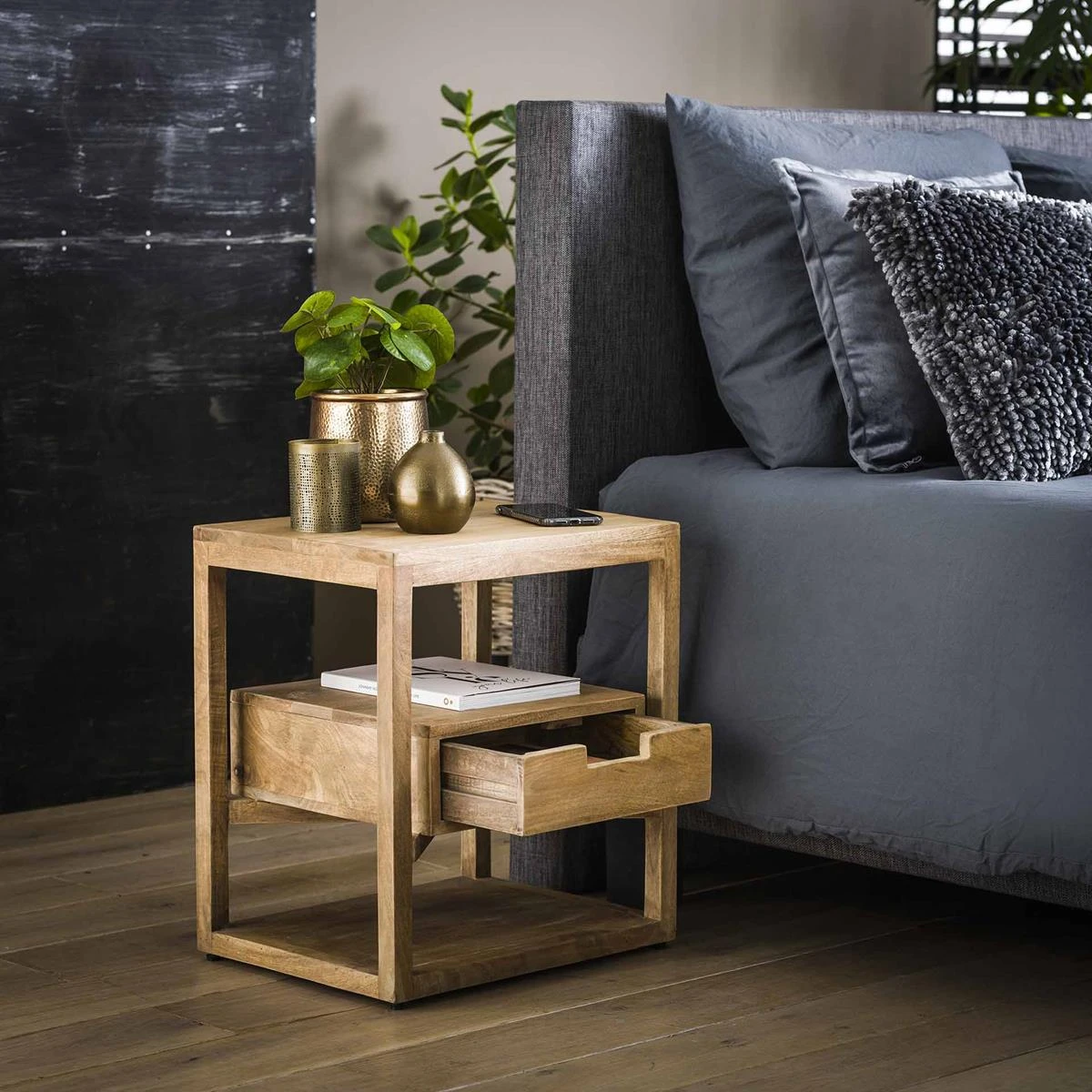 - Dit nachtkastje ‘Sahara’ is uitgevoerd in mango hout met een zandkleur
