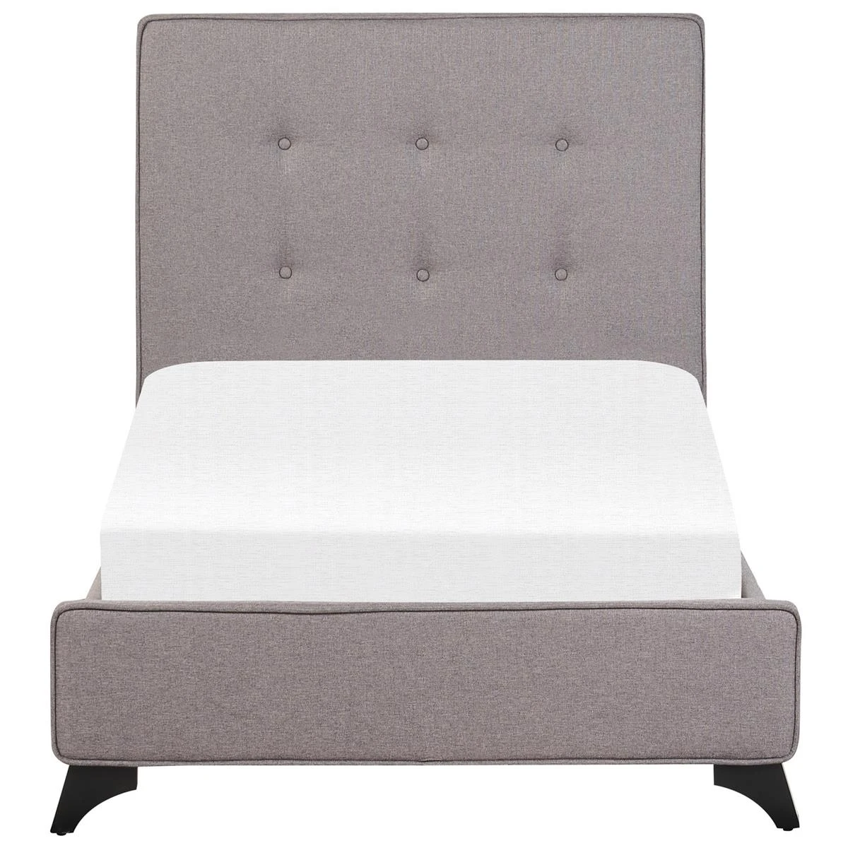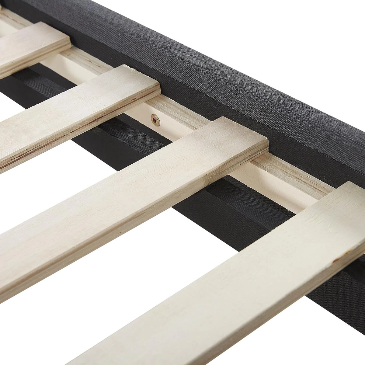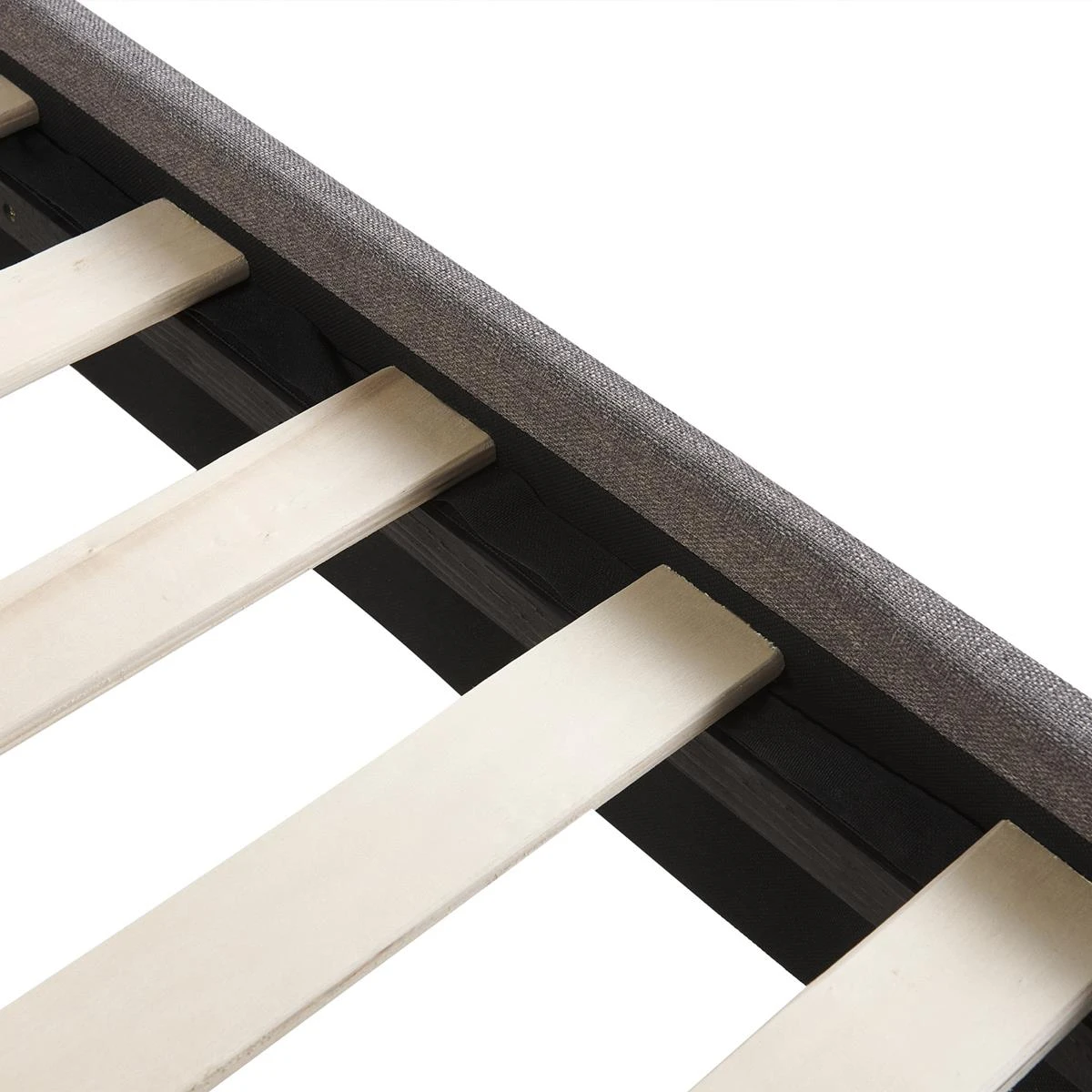 Dit prachtige gestoffeerde bed heeft een mooi, tijdloos ontwerp. Het zacht gewatteerde bedframe is verwerkt in een donkergrijze, duurzame bekleding in polyester stof. Als een opvallend detail valt het hoge hoofdeinde op, dat is voorzien van decorati