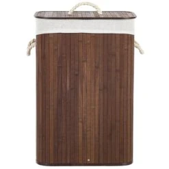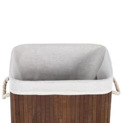 Compact en praktisch – zo kan deze wasmand worden omschreven. Het is gemaakt van bamboehout en heeft een solide constructie en een eenvoudig maar esthetisch ontwerp. De binnenkant is opgevuld met uitneembare en wasbare stof voor hygiënisch gebruik,