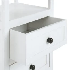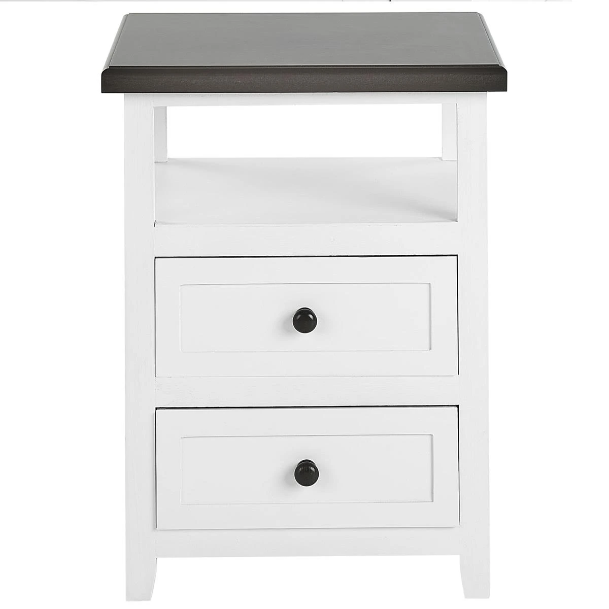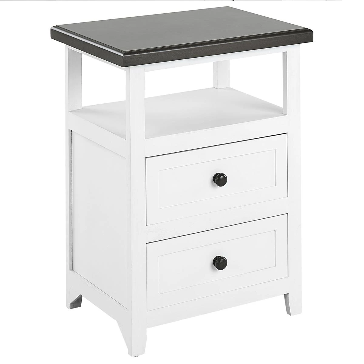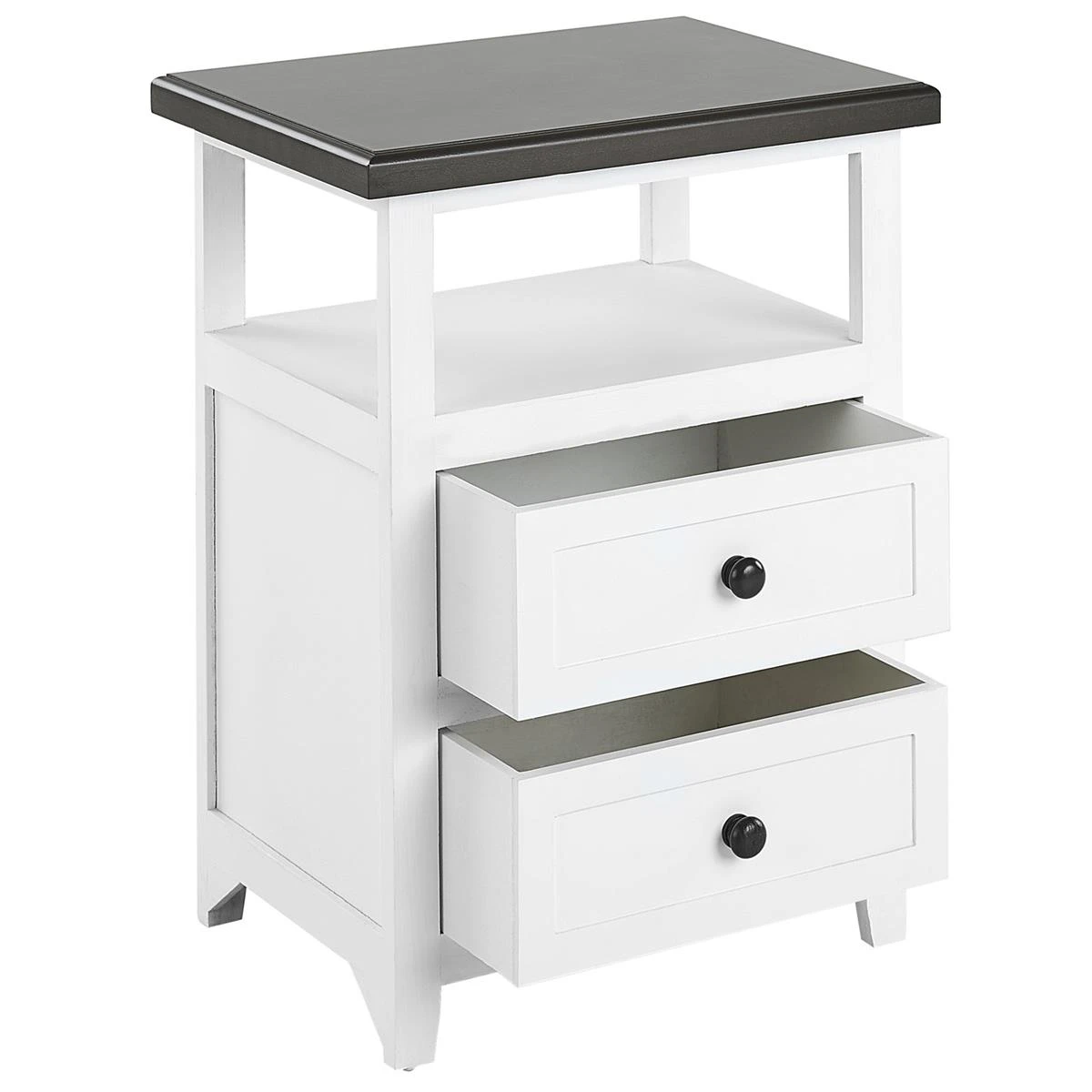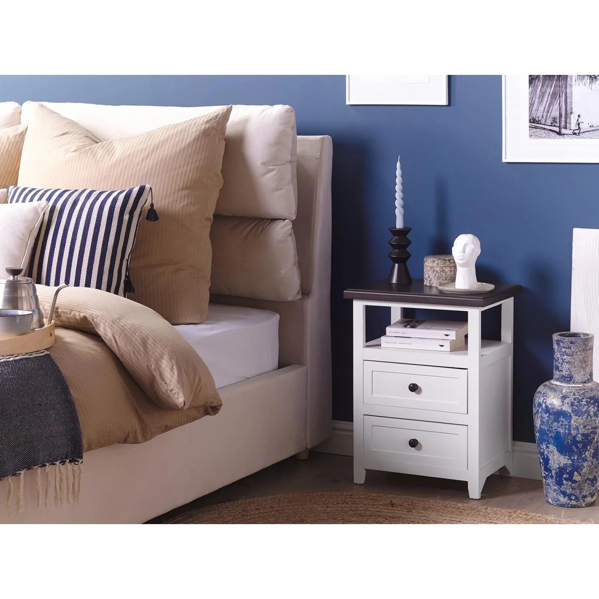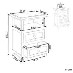 Dit nachtkastje is een stijlvolle aanvulling voor alle slaapkamers. Het kastje bestaat uit 2 lades waar je van alles in kan bewaren en een open plank aan de bovenkant waar je je favoriete boeken kan opslaan. Het witte kastje en het contrast van de b