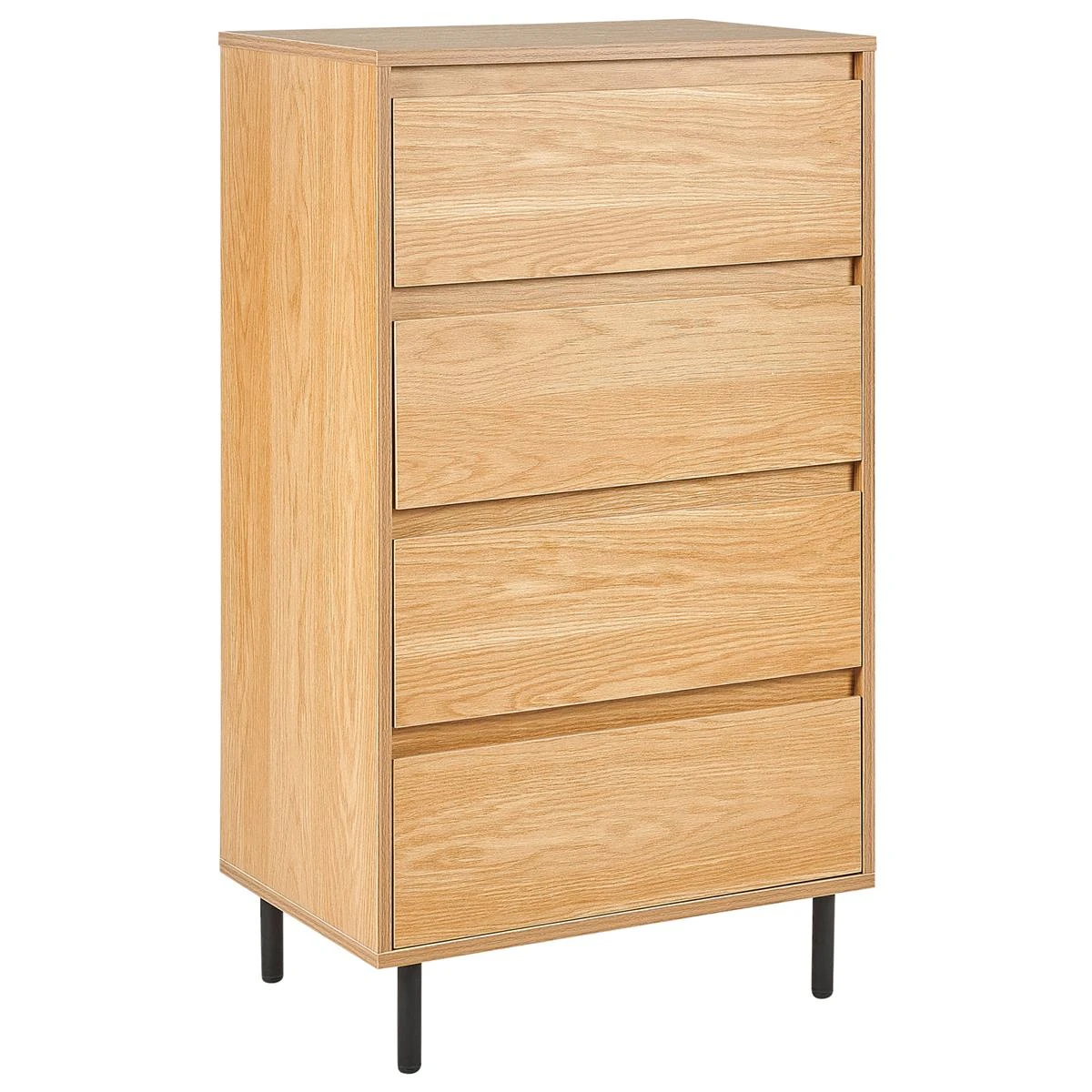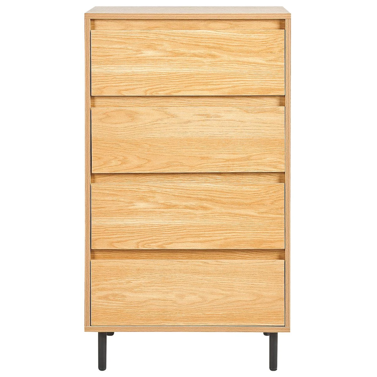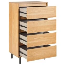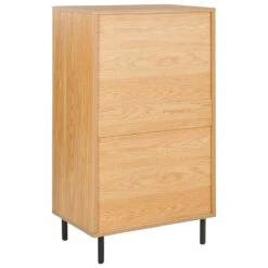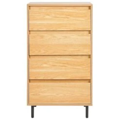 Upgrade je leefruimte met dit elegante hoge dressoir. De lichte houtachtige afwerking harmonieert prachtig met de moderne zwarte metalen poten van dit meubel met vier lades. Elk opbergvak biedt genoeg ruimte voor een opgeruimde en stijlvolle inricht
