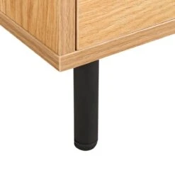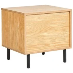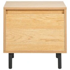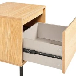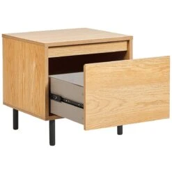 Geef je slaapkamer een stijlvolle uitstraling met dit prachtige nachtkastje. De afwerking imiteert natuurlijk hout in een lichte kleur en wordt gecombineerd met slanke zwarte metalen poten die een moderne touch toevoegen. Met zijn ruime lade combine