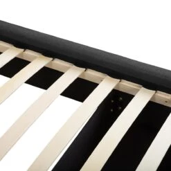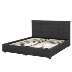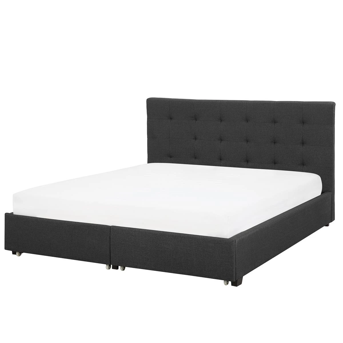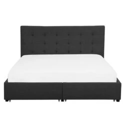 Elegantie en comfort zijn de kenmerken van dit gestoffeerde bed. Een zacht hoofdeinde met decoratieve quilting zorgt voor comfort en een stijlvolle uitstraling. De donkergrijze bekleding is gemaakt van een stof met linnenstructuur, vuilafstotend en