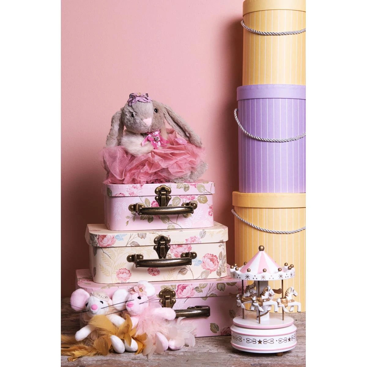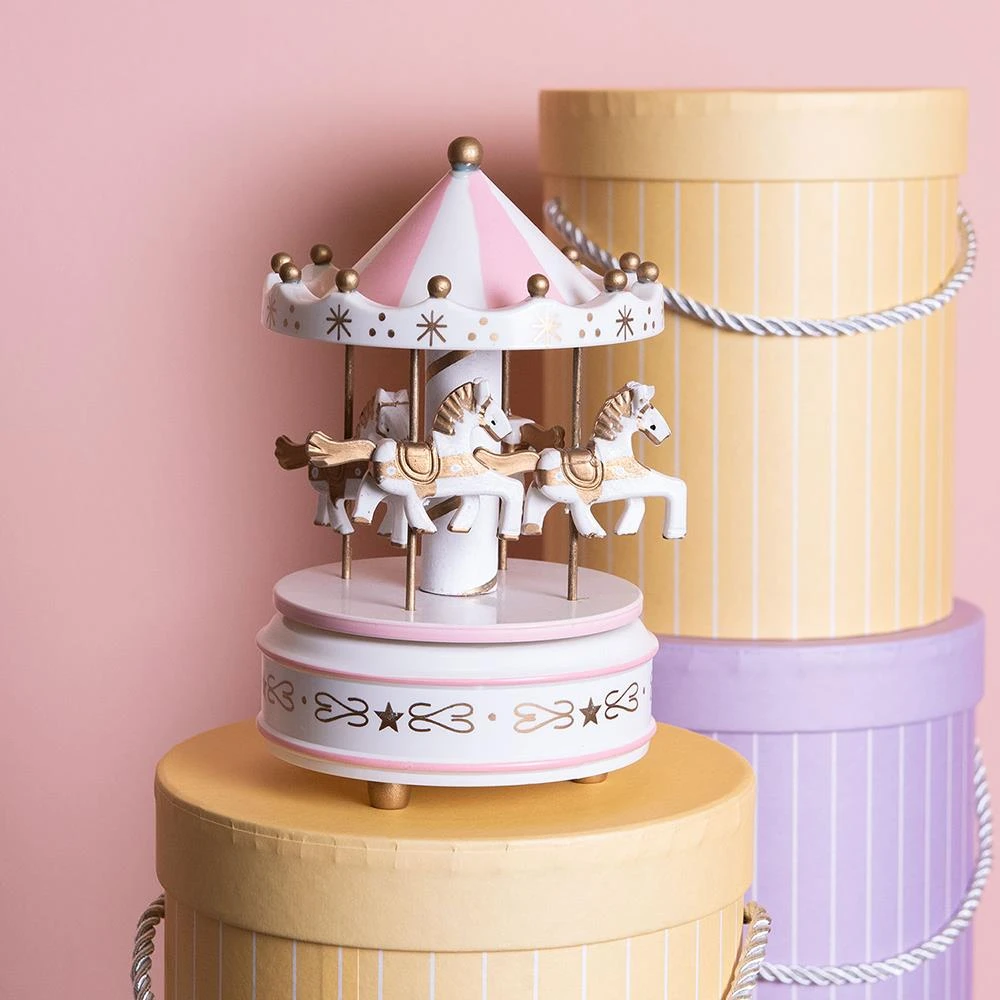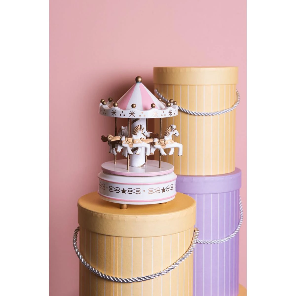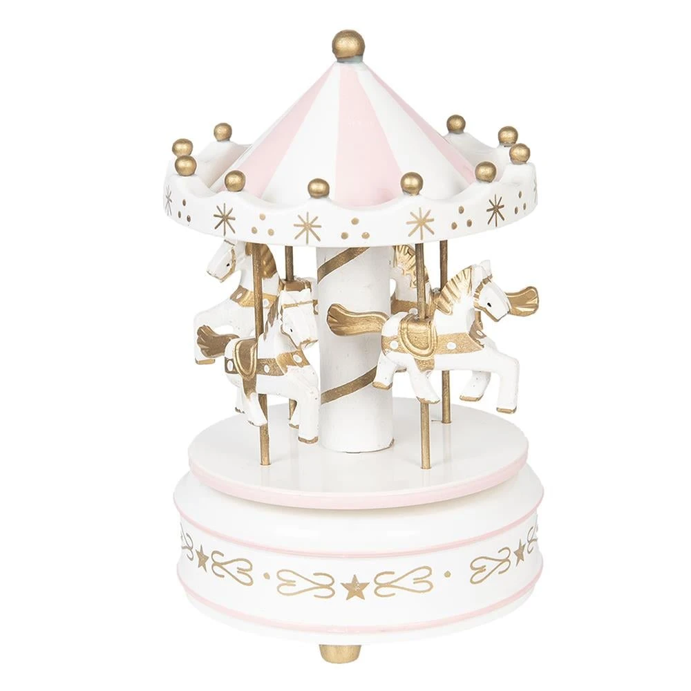 Klassieke muziek box in de vorm van een draaimolen met paardjes in de kleuren wit, roze en goudkleurig van het merk Clayre & Eef