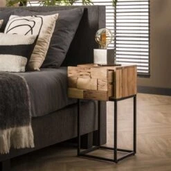 Dit nachtkastje ‘mill’ is uitgevoerd in acacia hout. Het nachtkastje heeft een lade en een metalen onderstel.