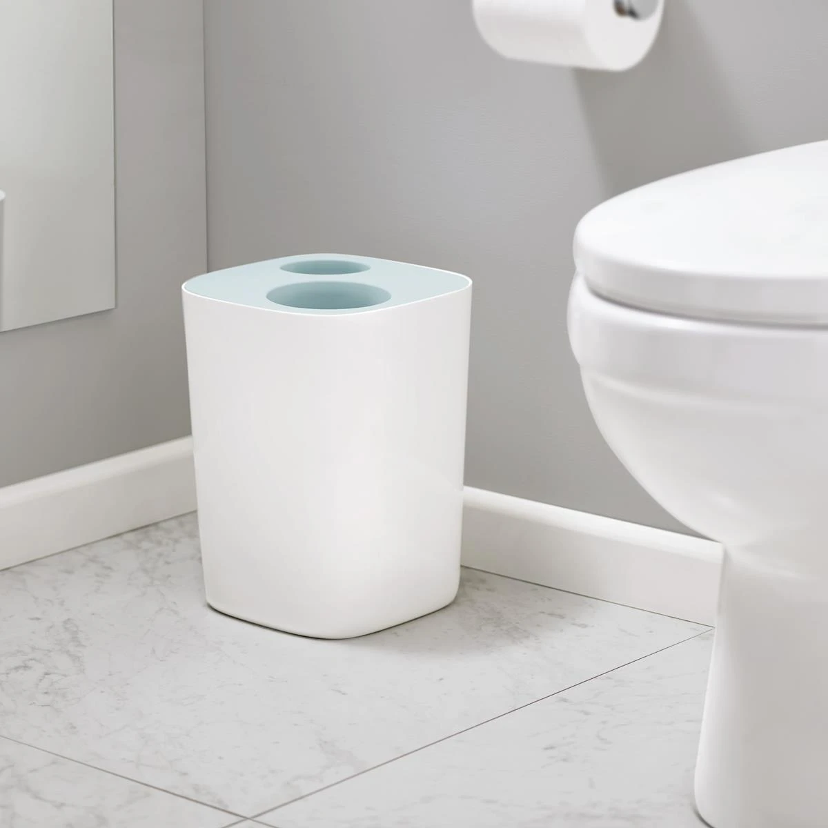 Afval scheiden kan ook in de badkamer! Wat dacht je van die lege wc-rollen of die plastic shampooflessen? Deze kun je heel eenvoudig scheiden in de Joseph Joseph Split afvalemmer met de twee openingen. De kleine opening gebruik je voor de watjes.