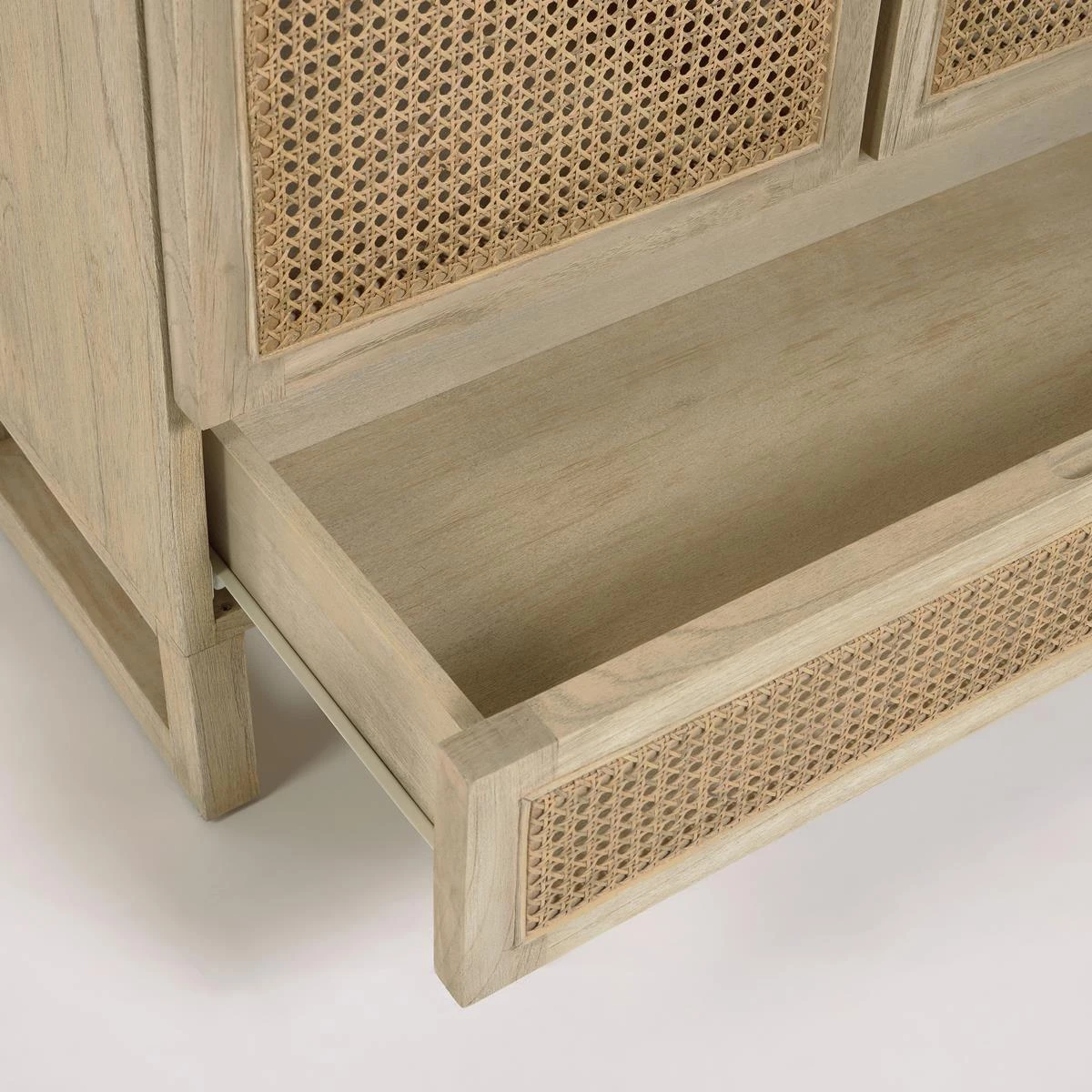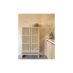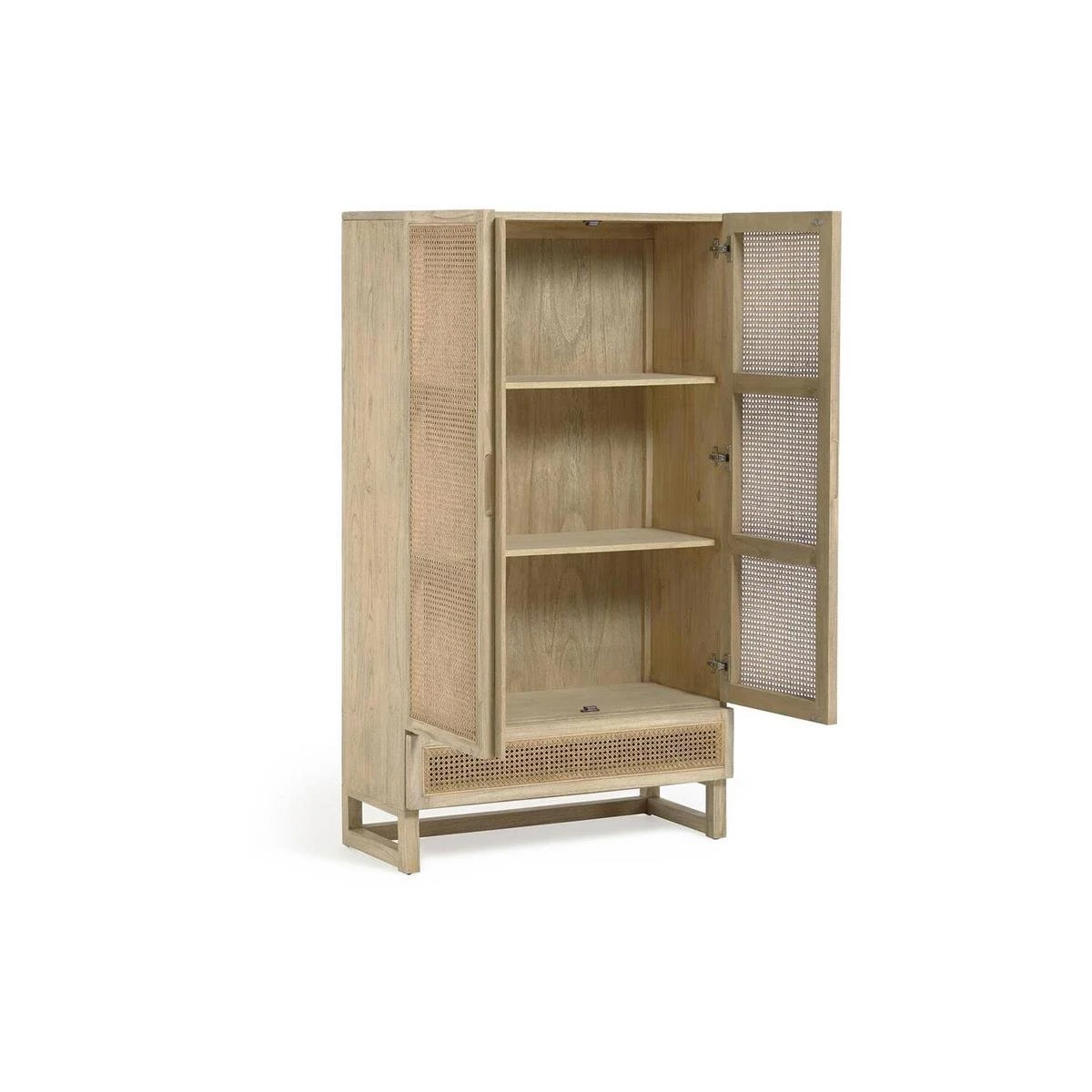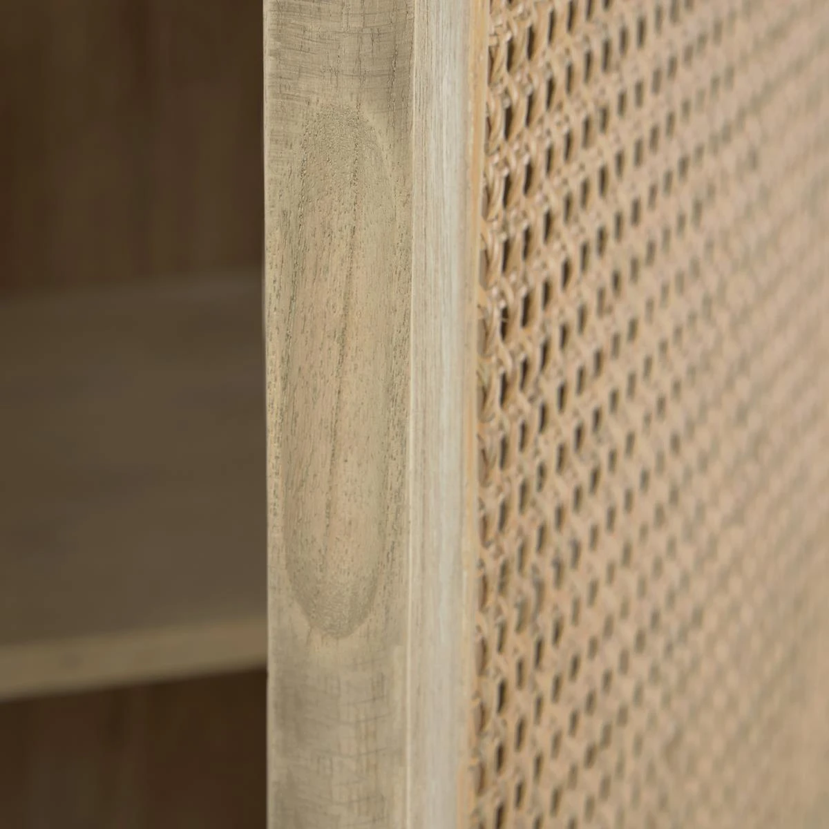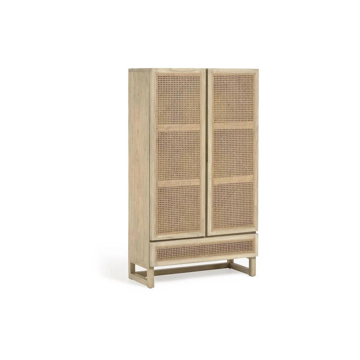 - Kledingkast van massief mindihout en fineer, 90 x 58 cm. Elke voorkant is gemaakt van gevlochten rotan en heeft een unieke kleur en tekening.