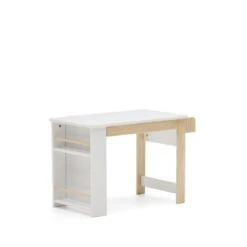 - Bureau van MDF met wit gelakte afwerking en poten van massief dennenhout.