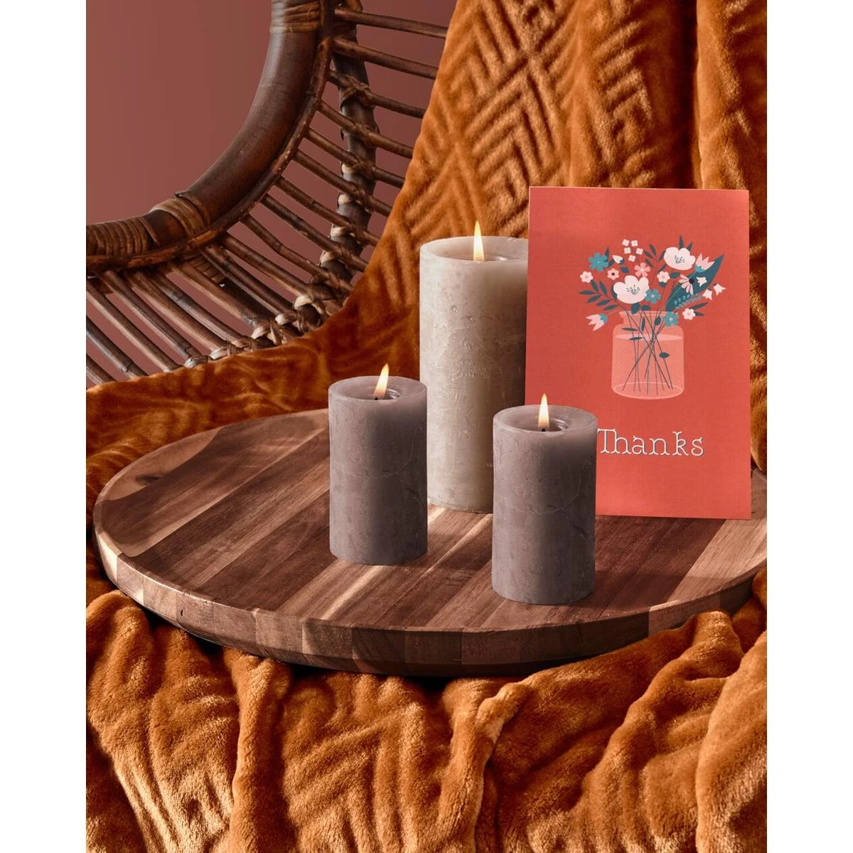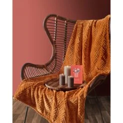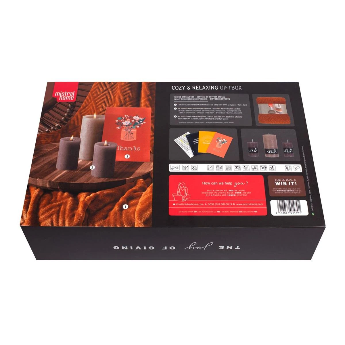 Mistral Home – Giftbox – Cadeau – Flannel plaid 130×170 cm met 3 rustieke kaarsen en postkaartjes – Deco rust – Roestkleurig
