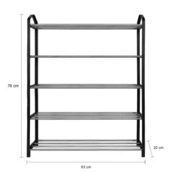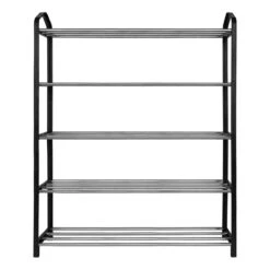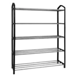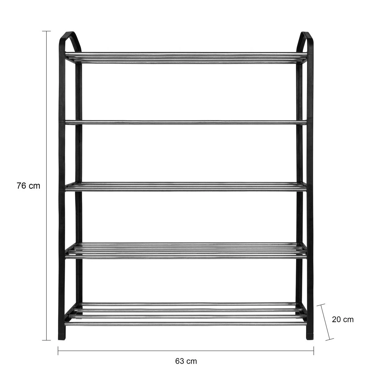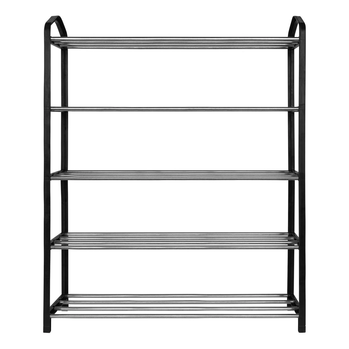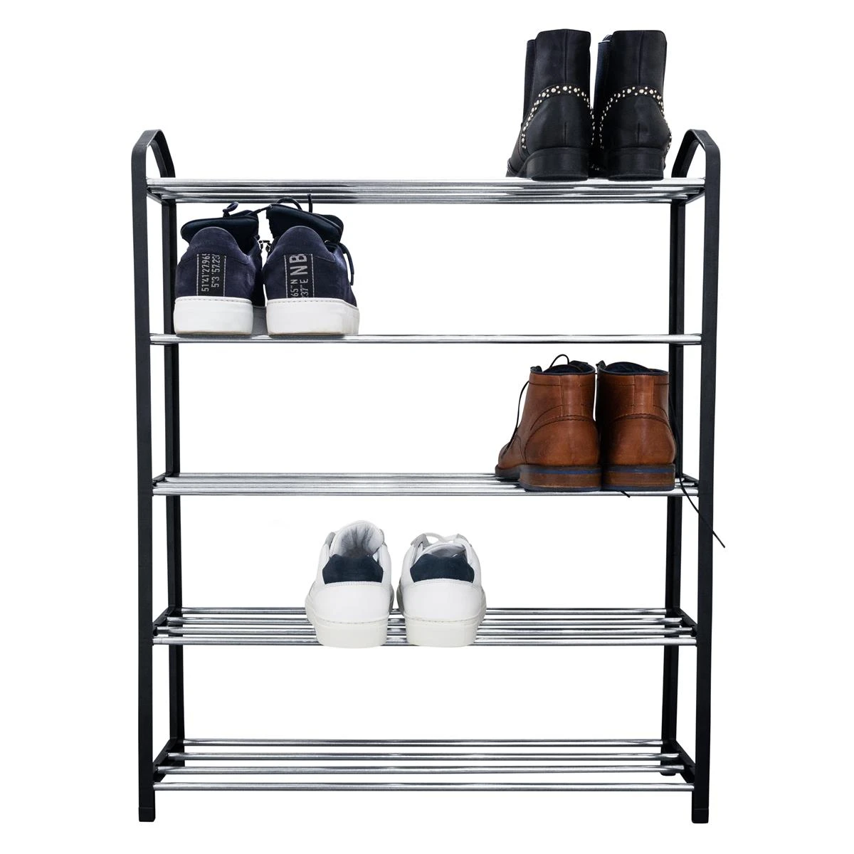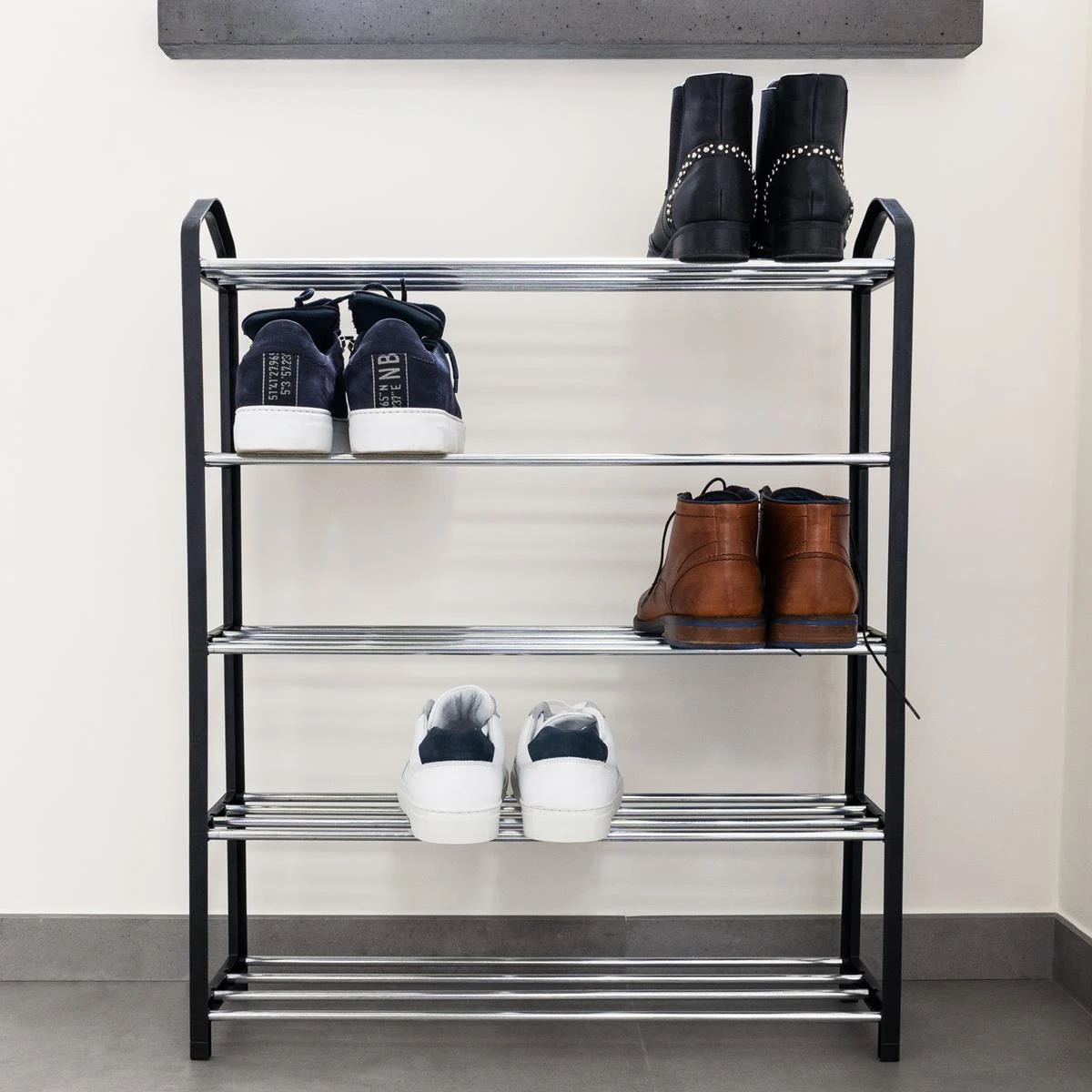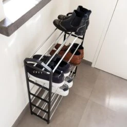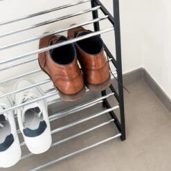 - Het schoenenrek heeft een simpel design in zwart en zilver.