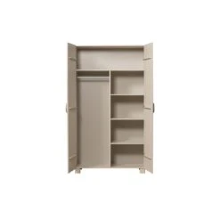 De Noah 2-deurs kast is gevormd uit geborsteld grenenhout afgewerkt in een frisse kleur: dust. Het interieur is uitgevoerd in onbehandeld, blank grenenhout. De achterzijde van de kast is gemaakt van geperst HDF materiaal met een dust-kleurige afwerking.