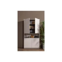 De Finca buffet-/opbergkast 110 cm is de brede variant, de smalle buffetkast is een 1-deurs van 40 cm breed. De bovenste twee deuren van de Finca buffetkast dekken drie handige opbergvakken af. Hieronder bevindt zich een open vak voor het presenteren van jouw mooiste woondecoratie. De twee onderste deuren houden nog eens twee ruime opbergruimten uit het zicht. De twee bovenste – en twee onderste vakken hebben elk een hoogte van 32 cm, een breedte van 108 cm en een diepte van 37 cm. De twee vakken in het midden hebben een hoogte van 34 cm. De onderrand van de buffetkast laat 7 cm ruimte over aan de voorzijde, hierdoor lijkt het meubel te zweven.