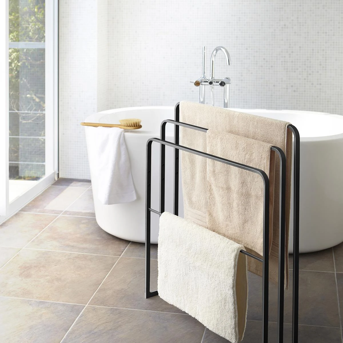 Dankzij het moderne design past deze slanke Yamazaki Tower handdoekhouder in elke kamer. Er is ruimte voor veel handdoeken en badmatten. Het onderste deel biedt meer opbergruimte voor bijvoorbeeld wasgoed of badspullen. Opgeruimd staat netjes!