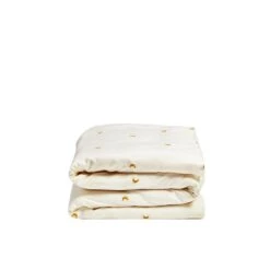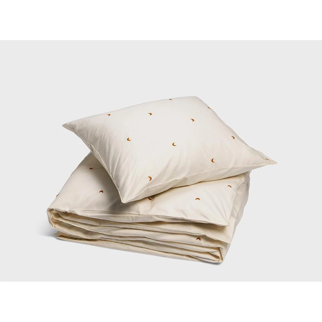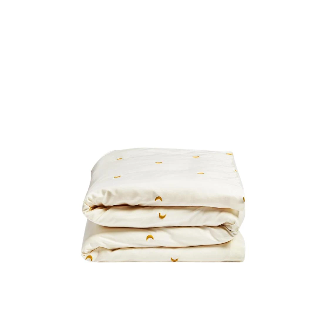 Zacht katoen satijn in een warme witte kleur is al hemels om onder te slapen, maar om het voor kinderen extra leuk te maken om naar bed te gaan, zijn er okerkleurige maantjes op geborduurd in glanzend garen. Het zijn net gouden glimlachjes die uw