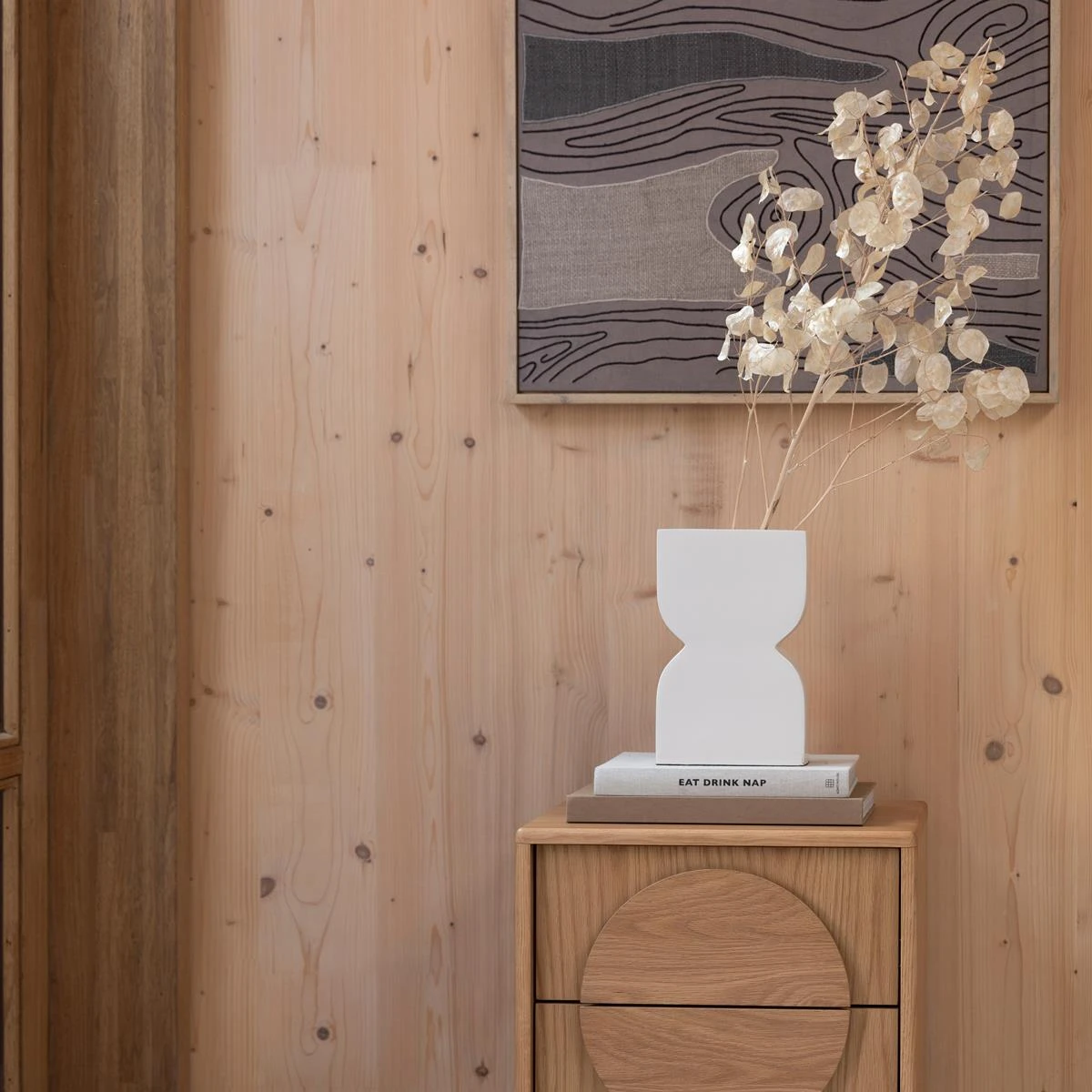 Het Zuiver Groove nachtkastje combineert stijlvol, retro design met royale opbergruimte. De deurtjes zijn voorzien van ronde houten elementen en rust op de elegante, ronde poten. Maak het plaatje compleet met een mooie lamp er bovenop!